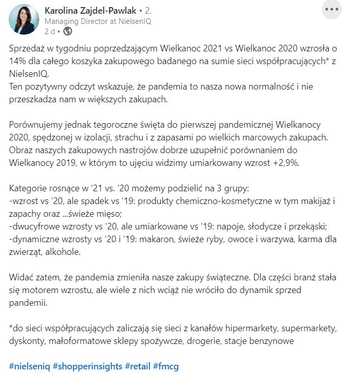 – Ten pozytywny odczyt wskazuje, że pandemia to nasza nowa normalność i nie przeszkadza nam w większych zakupach. Porównujemy jednak tegoroczne święta do pierwszej pandemicznej Wielkanocy 2020, spędzonej w izolacji, strachu i z zapasami po wielkich marcowych zakupach – mówi Karolina Zajdel-Pawlak, Dyrektor Zarządzająca NielsenIQ. – Obraz naszych zakupowych nastrojów dobrze uzupełnić porównaniem do Wielkanocy 2019, w którym to ujęciu widzimy umiarkowany wzrost o 2,9% – dodaje.