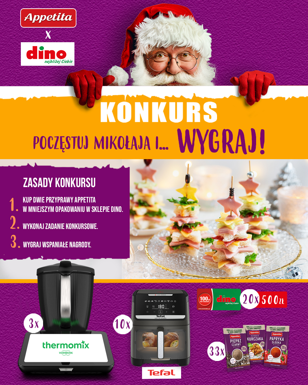 Marka Appetita zaprasza do udziału w świątecznym konkursie „Poczęstuj Mikołaja i… WYGRAJ!”, który łączy kreatywność z kulinarną zabawą i zachęca do tworzenia wyjątkowych potraw inspirowanych grudniową atmosferą. Uczestnicy mogą zdobyć atrakcyjne nagrody, w tym m.in. 3 urządzenia Thermomix™ 7, 10 frytownic beztłuszczowych Tefal Silent Technology oraz 20 bonów do marketów Dino o wartości 500 zł, a także zestawy przypraw Appetita.