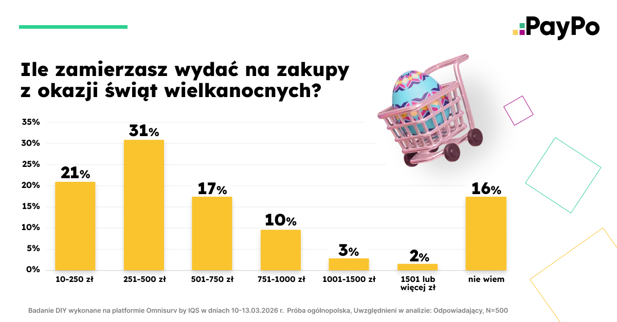 Z badania PayPo wynika, że Polacy planują umiarkowane wydatki na Wielkanoc i rzadko decydują się na wyższe budżety. Największa grupa respondentów (31%) zamierza przeznaczyć na świąteczne zakupy od 251 do 500 zł. Jednocześnie 21% badanych planuje wydać od 10 do 250 zł, a 17% deklaruje budżet na poziomie 501–750 zł. Natomiast 16% przyznaje, że na tym etapie nie jest jeszcze w stanie określić swoich wydatków. Wyższe kwoty pojawiają się wyraźnie rzadziej. 10% badanych planuje przeznaczyć od 751 do 1000 zł, 3% od 1001 do 1500 zł, a 2% deklaruje wydatki przekraczające 1500 zł. Wyższe budżety pozostają zatem domeną niewielkiej części respondentów.