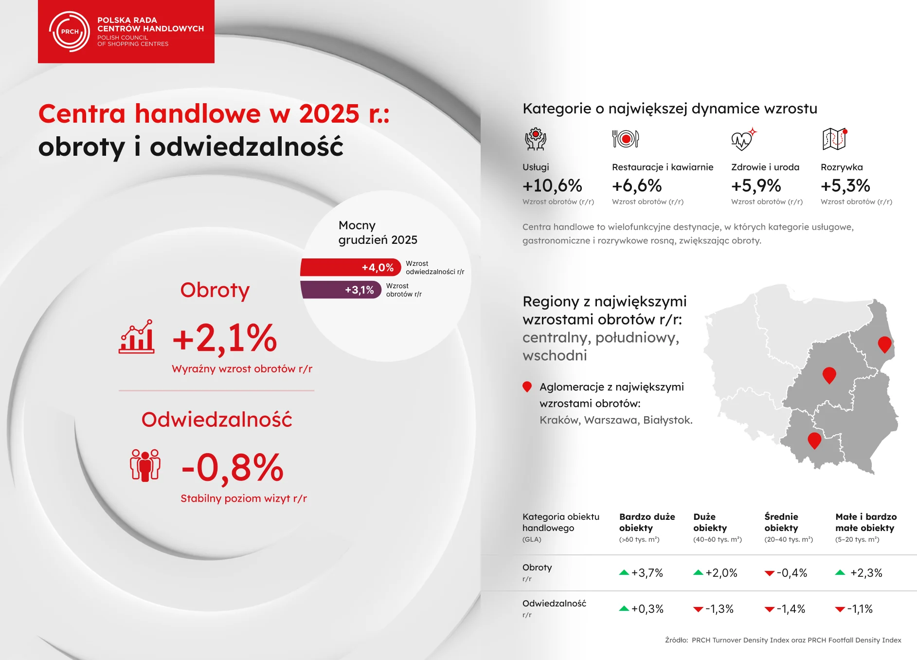 Grudzień przyniósł wyraźne odbicie sprzedaży w centrach handlowych. Z danych Polskiej Rady Centrów Handlowych (PRCH), opartych na wskaźnikach PRCH Turnover Density Index oraz PRCH Footfall Density Index, wynika, że obroty wzrosły o 3,1% rdr., a odwiedzalność zwiększyła się o 4%. W całym 2025 roku sprzedaż była wyższa o 2,1% przy niemal stabilnym poziomie footfall (–0,8% rdr.).