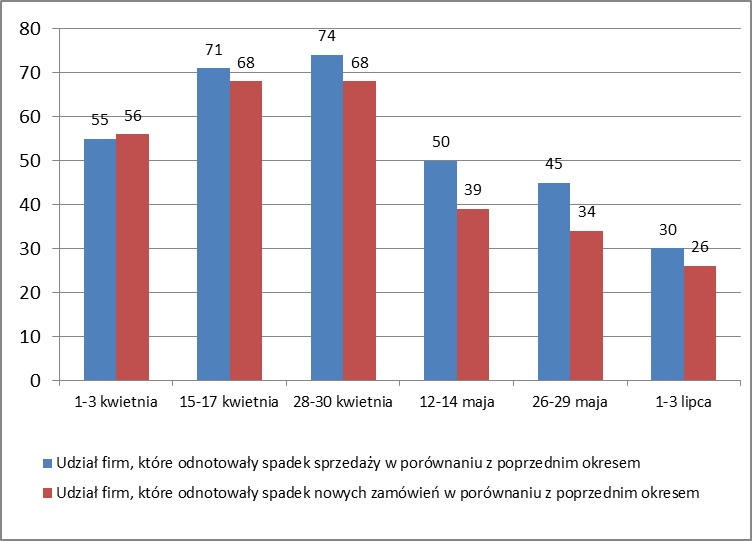 Poprawia się sytuacja w zakresie nowych zamówień. W sektorze handlu największe spadki zamówień miały miejsce w połowie i pod koniec kwietnia (68%), kiedy zamknięte były sklepy z artykułami nieżywnościowymi i centra handlowe. W maju nastąpiła znaczna poprawa; udział firm deklarujących spadki zmniejszył się do 34%, a w badaniu lipcowym odnotowano dalszą poprawę; udział firm handlowych wskazujących na spadek zamówień obniżył się do 26%.