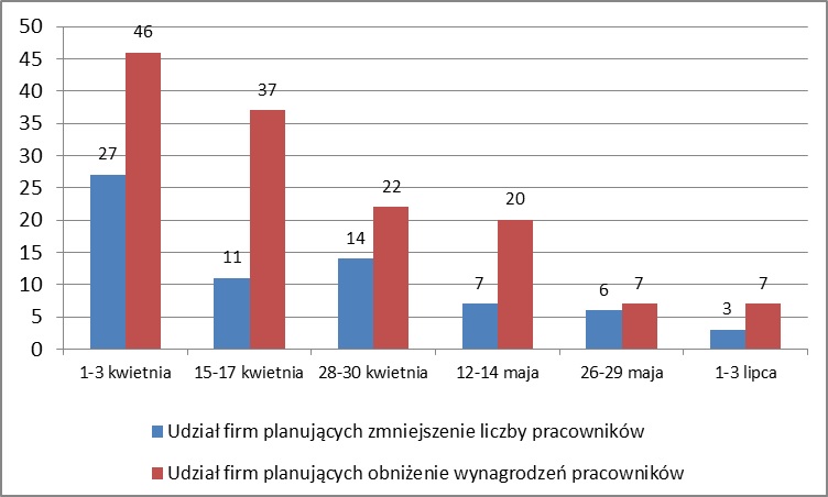 W badaniu lipcowym, udział firm handlowych planujących redukcję zatrudnienia zmniejszył się do niecałych 3%, a ponad 8% zamierzało nawet zwiększyć liczbę pracujących. Tymczasem w badaniu z początku kwietnia aż 27% firm zamierzało zwalniać pracowników. Od pierwszej fali badania, w kolejnych pomiarach, systematycznie malał odsetek firm handlowych, planujących obniżenie wynagrodzeń – z 46% w badaniu na początku kwietnia do 3% w badaniu lipcowym. Warto podkreślić, że we wszystkich falach badania, firmy handlowe, aby ratować sytuację finansową firmy, były bardziej skłonne do obniżania poziomu wynagrodzeń pracowników niż redukcji zatrudnienia. Wskazuje to na bardzo odpowiedzialne podejście kierownictwa firm handlowych do swoich pracowników, mimo nawarstwiających się trudnych sytuacji (np. brak pracowników w początkowym okresie pandemii, ograniczenia liczby klientów w sklepach, brak obrotów lub ich spadek, zwiększone koszty handlowe wynikające z konieczności zapewnienia pracownikom i klientom bezpieczeństwa sanitarnego). Zidentyfikowane korzystne zmiany w planach firm dotyczących zatrudnienia są wynikiem poprawy nastrojów przedsiębiorców w wyniku „odmrożenia gospodarki” i wprowadzania tarczy antykryzysowych.