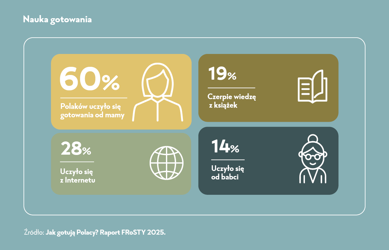 Choć dziś mamy dostęp do tysięcy przepisów online, to podstaw gotowania nauczyła Polaków mama – to właśnie ją jako pierwszą nauczycielkę, wskazało 60% respondentów. Na kolejnym miejscu były internet – 28% oraz książki kucharskie – 19% oraz babcie – 14%.