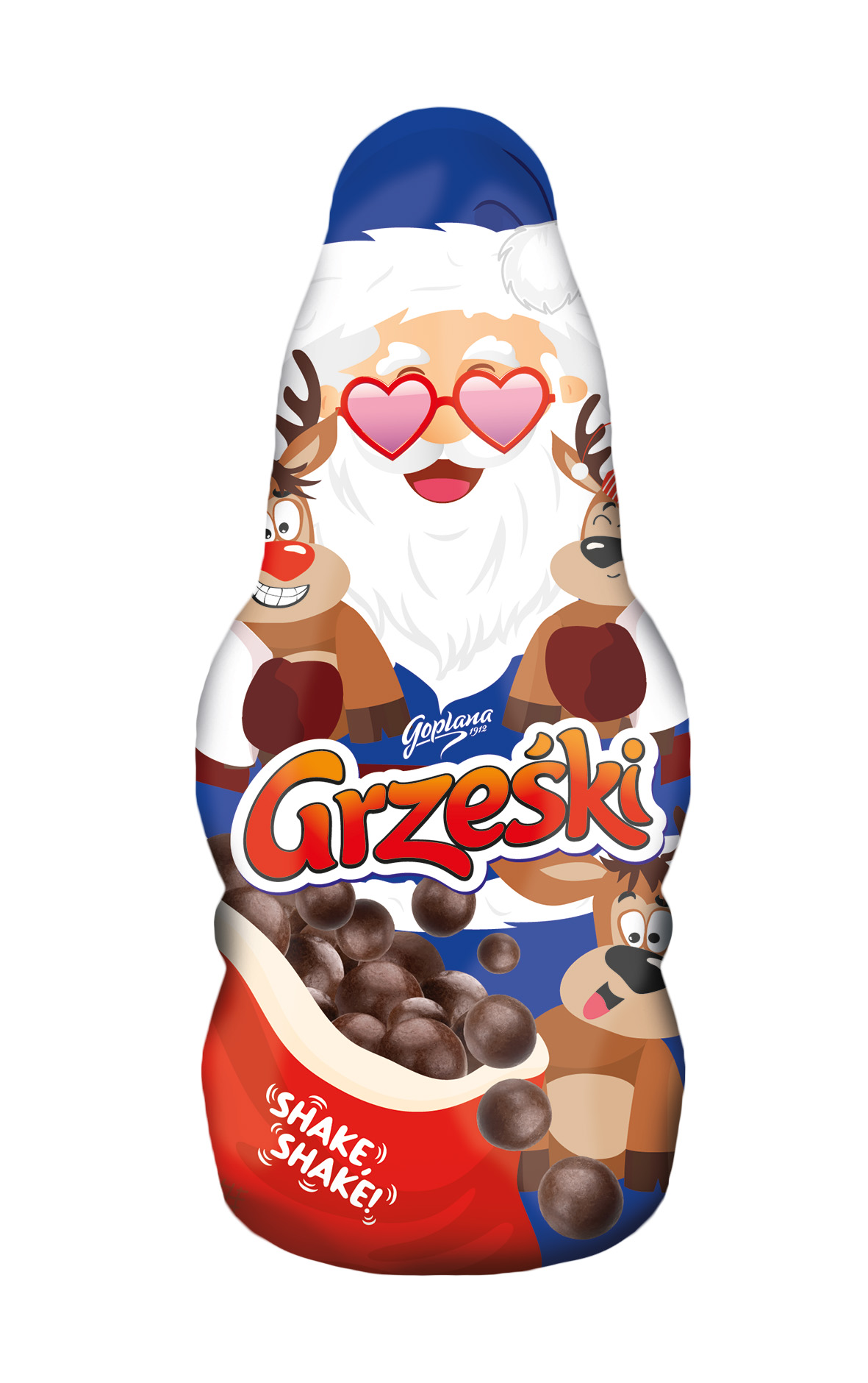 Czekoladowy Mikołaj Grześki z chrupiącymi drażami kakaowymi (90 g) to propozycja, która łączy wyjątkowy smak z formą pełną humoru – w stylu kultowych wafli. Każdy Mikołaj to mnóstwo mlecznej czekolady i kakaowe draże, które zaskakują strukturą i dodają całości lekkości. Produkt dostępny w trzech wersjach: energicznego narciarza, przebojowego DJ-a i uroczego słodziaka – wszystkie z nich wnoszą trochę zabawy i oddają charakter marki.