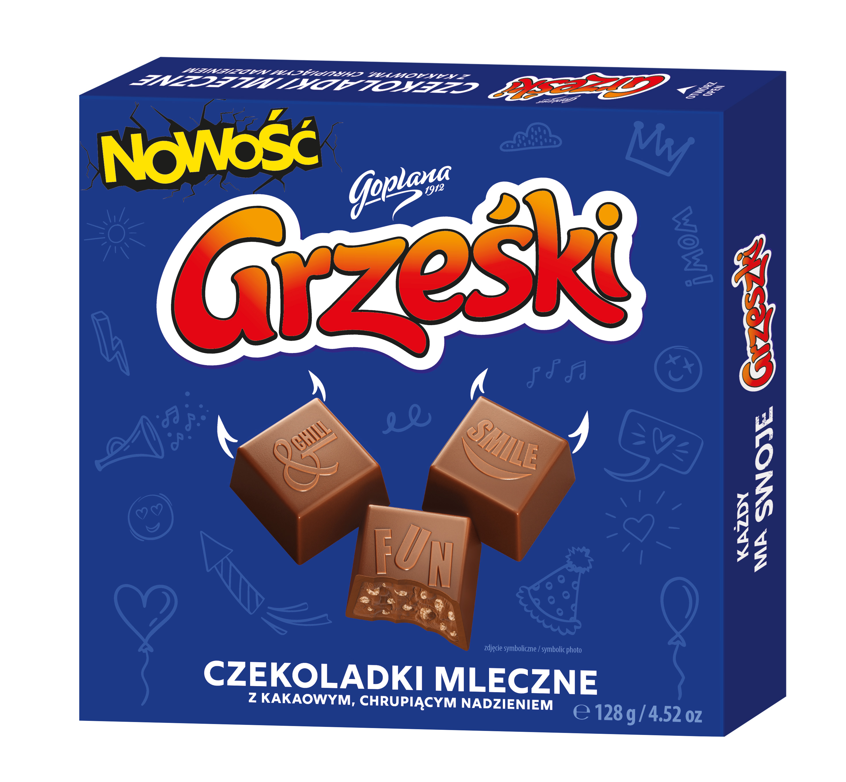 - Mleczne czekoladki Grześki z kakaowym, chrupiącym nadzieniem128 g, sugerowana cena detaliczna ok. 14,99 zł