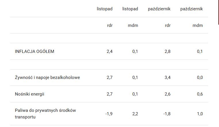 Inflacja w listopadzie 2025 r. spadła do 2,4 % z 2,8 % w październiku – poinformował Główny Urząd Statystyczny (GUS). Ceny towarów i usług konsumpcyjnych w porównaniu z poprzednim miesiącem wzrosły o 0,1 %. źródło: PAP/GOV oprac.: K. Walkowiak