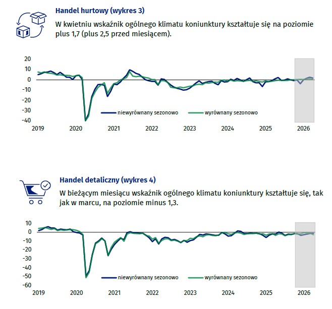 GUS opublikował informację sygnalną dot. koniunktury gospodarczej w kwietniu 2026 r. Wskaźniki w większości prezentowanych sektorów wskazują na stabilizację lub poprawę koniunktury w gospodarce. Najbardziej znaczącą poprawę obserwuje się w sekcji zakwaterowanie i gastronomia. Istotne pogorszenie koniunktury odnotowano w sekcji transport i gospodarka magazynowa.