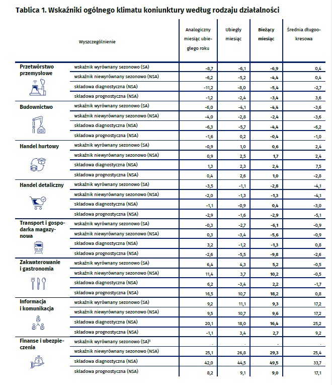 W większości badanych obszarów w porównaniu z poprzednim miesiącem sygnalizowana jest stabilizacja lub poprawa koniunktury w przypadku składowych diagnostycznych, natomiast w przypadku składowych prognostycznych odnotowuje się jej stabilizację lub pogorszenie.