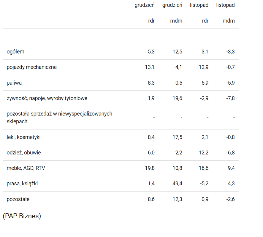 Sprzedaż detaliczna liczona w cenach stałych w grudniu 2025 r. zwiększyła się o 5,3 % w porównaniu z analogicznym okresem roku poprzedniego oraz o 12,5 % względem listopada – poinformował Główny Urząd Statystyczny (GUS). Z kolei w ujęciu nominalnym sprzedaż wzrosła w skali roku o 5,0 %.