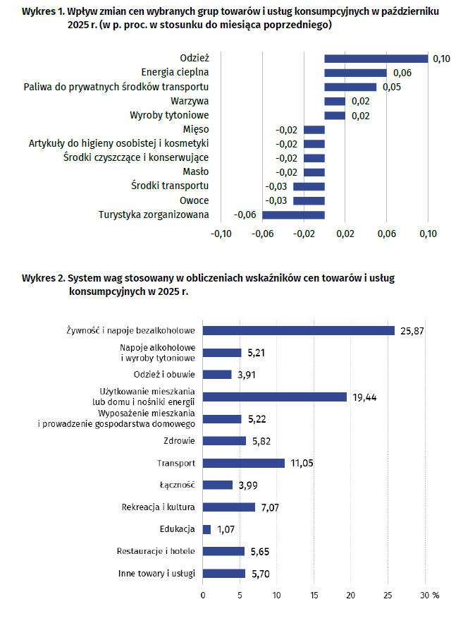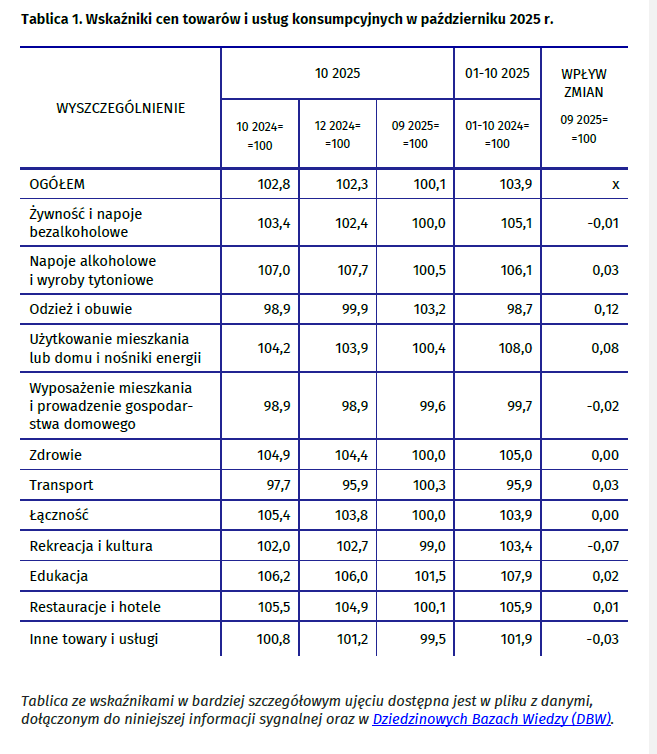 Ceny towarów i usług konsumpcyjnych w październiku 2025 r. wzrosły o 2,8% w porównaniu z analogicznym miesiącem ub. roku (przy wzroście cen usług o 5,6% i towarów o 1,7%). W stosunku do poprzedniego miesiąca ceny wzrosły o 0,1% (przy wzroście cen towarów o 0,3% i spadku cen usług o 0,2%). Wskaźnik w skali roku (102,8) był taki sam jaki opublikowany w szybkim szacunku za październik br.