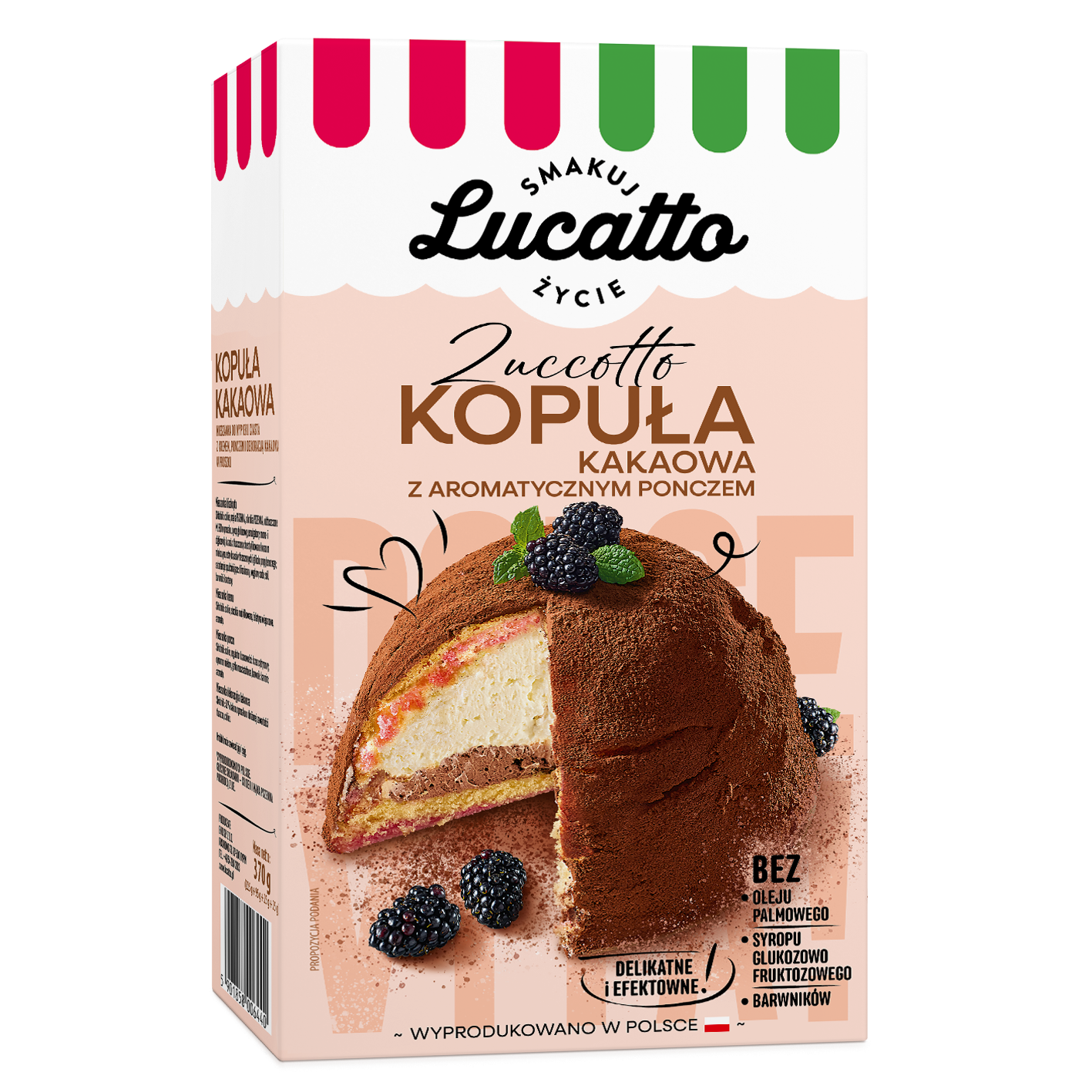 Nowość od Lucatto inspirowana stylem dolce vita! W prosty sposób przygotujesz elegancki deser o autentycznym włoskim smaku. W zestawie komplet składników: mieszanka do biszkoptu i kremu, poncz z nutą likieru Alchermes oraz kakaowa posypka. Efektowne ciasto, które zachwyci gości – idealne na każdą okazję! Masa netto: 370 g.