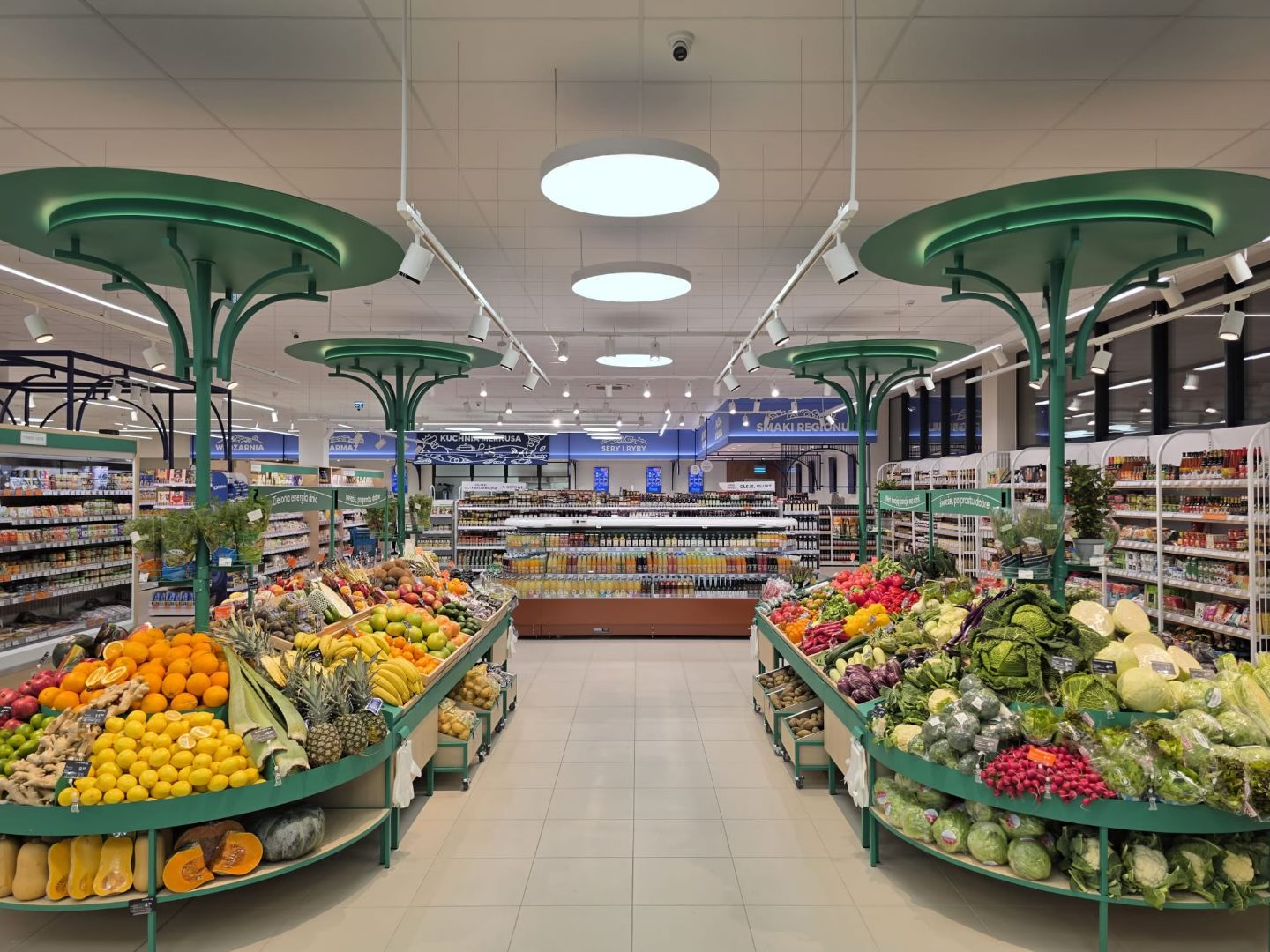 Na uwagę zasługują rozbudowane stoiska z owocami i warzywami, a także lada tradycyjna z mięsem, wędlinami, rybami i serami.