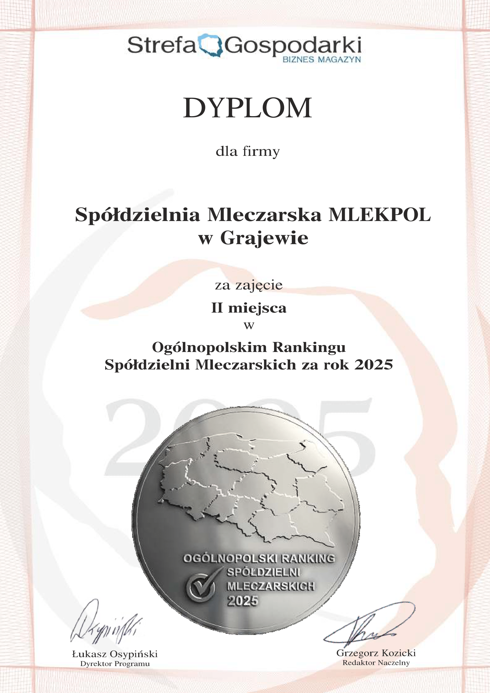 Spółdzielnia Mleczarska Mlekpol zajęła drugie miejsce w Ogólnopolskim Rankingu Najlepszych Spółdzielni Mleczarskich 2025, przygotowanym przez „Strefę Gospodarki” – niezależny dodatek do „Dziennika Gazety Prawnej”. To już kolejny rok z rzędu, w którym firma plasuje się na podium zestawienia.
