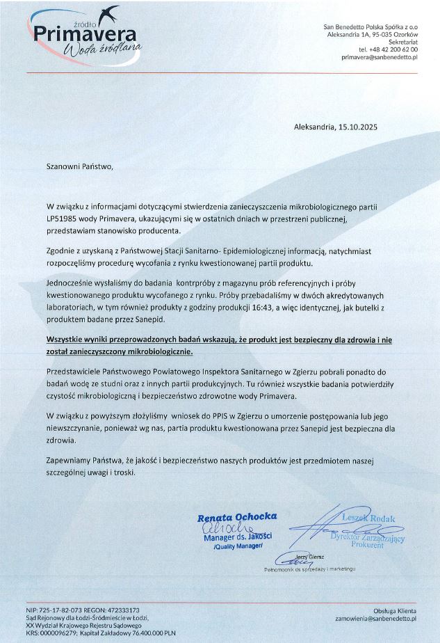 W związku z pojawiającymi się w ostatnich dniach informacjami o wykryciu zanieczyszczenia mikrobiologicznego w partii LP51985 wody Primavera, przedstawiamy stanowisko producenta.