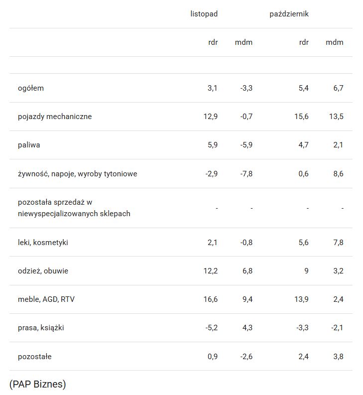 Według danych Głównego Urzędu Statystycznego, w listopadzie 2025 roku sprzedaż detaliczna liczona w cenach stałych była o 3,1 % wyższa niż rok wcześniej, natomiast w porównaniu z październikiem zmniejszyła się o 3,3 %.