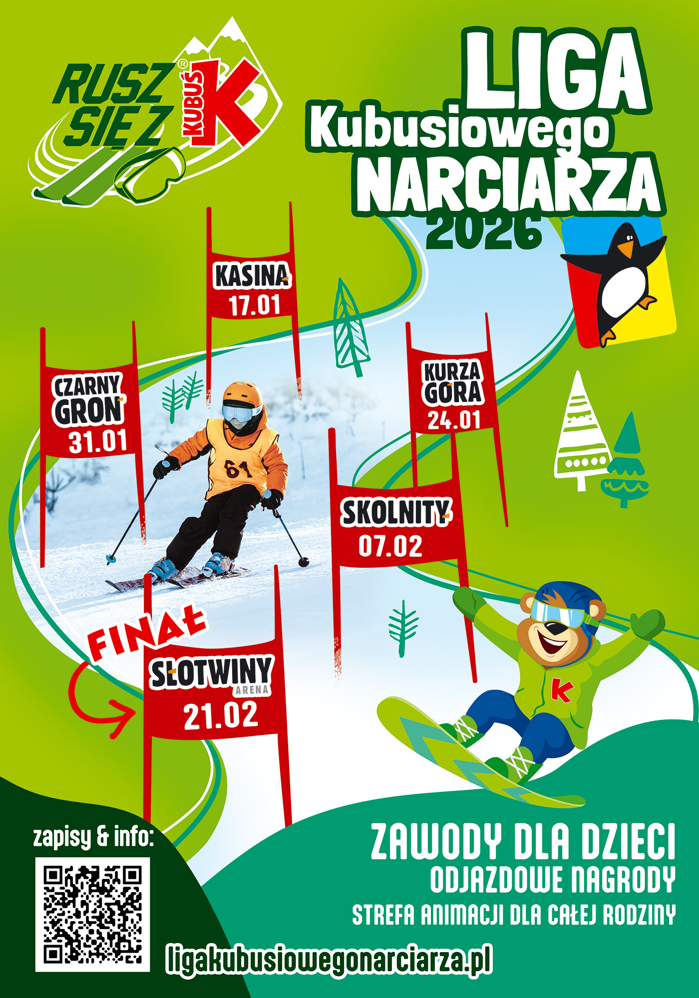 Liga Kubusiowego Narciarza to coroczny cykl zimowych eventów organizowany w ramach programu „Rusz się z K!”, którego misją jest zachęcanie dzieci do aktywności fizycznej. Jak co roku Kubuś odwiedzi 5 ośrodków narciarskich Grupy Pingwina – Kasinę, Kurzą Górę, Czarny Groń, Skolnity i Słotwiny. Już w najbliższą sobotę 17-go stycznia w Kasinie odbędzie się inauguracja Ligi, podczas której mali narciarze i snowboardziści, w wieku od 3-14 lat, będą mieli okazję powalczyć o atrakcyjne nagrody próbując swoich sił w slalomie gigancie.