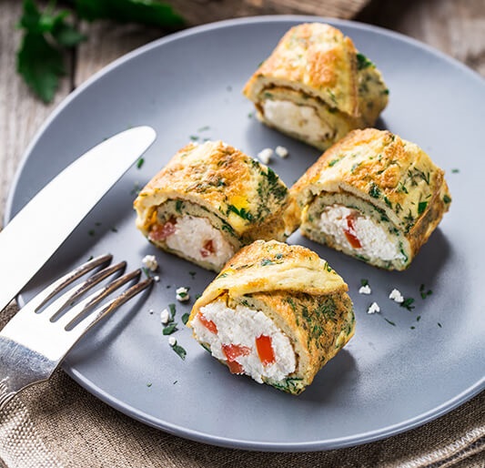 Na wystudzonym omlecie rozłóż twarożek, zwiń go w rulon i pokrój na kilkucentymetrowe kawałki.